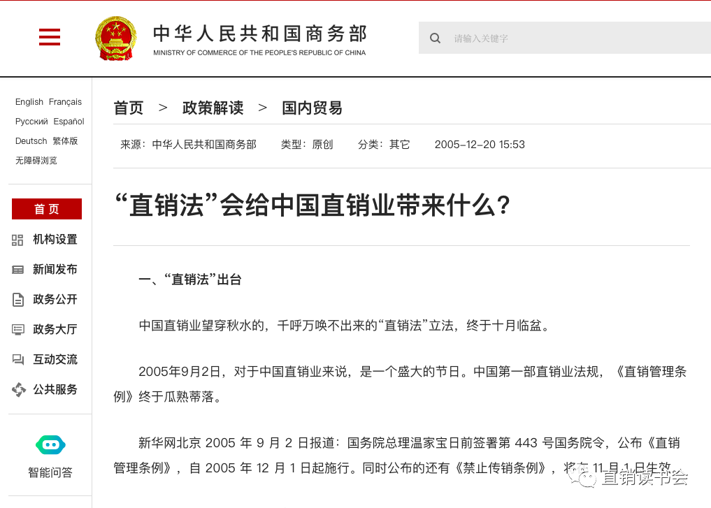 新华网北京 2005 年 9 月 2 日报道:国务院总理温家宝日前签署第 443 号国务院令,公布《直销管理条例》,自 2005 年 12 月 1 日起施行。同时公布的还有《禁止传销条例》,将在 11 月 1 日生效。