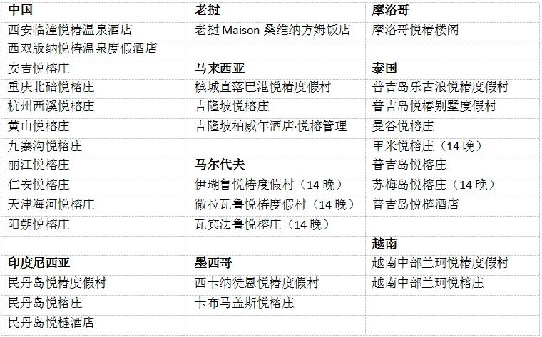 “悦隐境”长住礼遇可预订酒店列表: