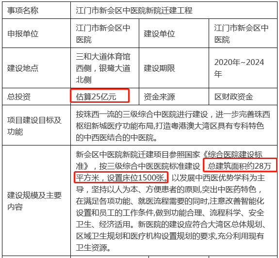 新会中医院新院选址三和大道西侧,交通大厦北侧,总建筑面积约28万㎡,设置床位1500张。项目估算总投资25亿元,建设期限为2020年-2024年。
