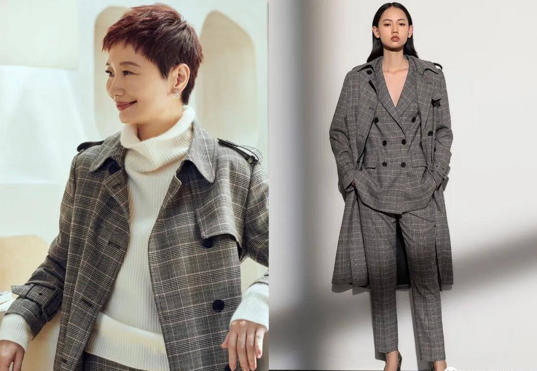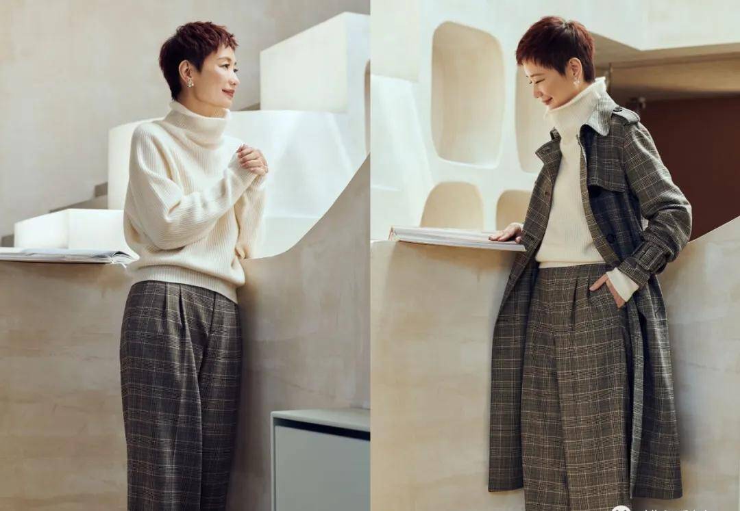 像前面晓雪那样配高领白毛衣,或者模特这样直接成套格纹look的“连连看”,都是可以让你第一眼看起来就很有气场的神器。
