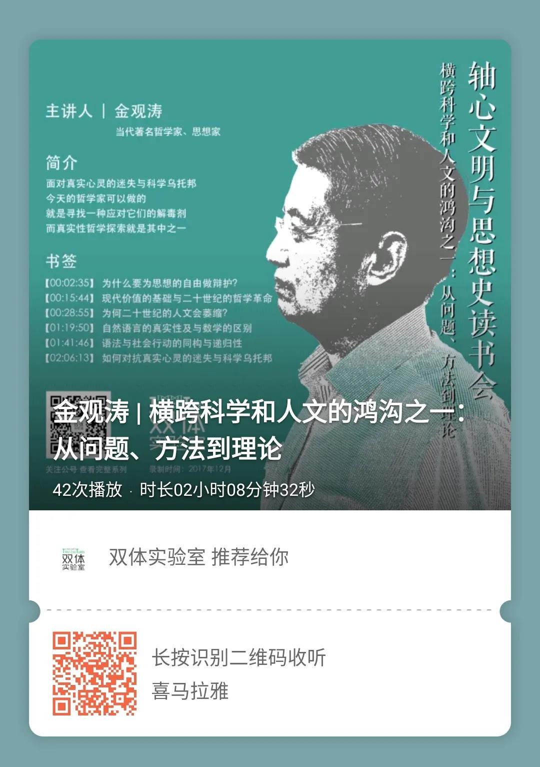 双体实验室近期整理了金观涛老师关于《横跨科学和人文的鸿沟之一:从问题、方法到理论》的讲座实录,目前音频文件已在喜马拉雅FM更新,欢迎大家收听。