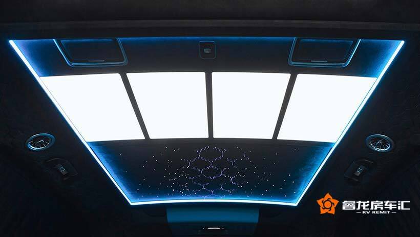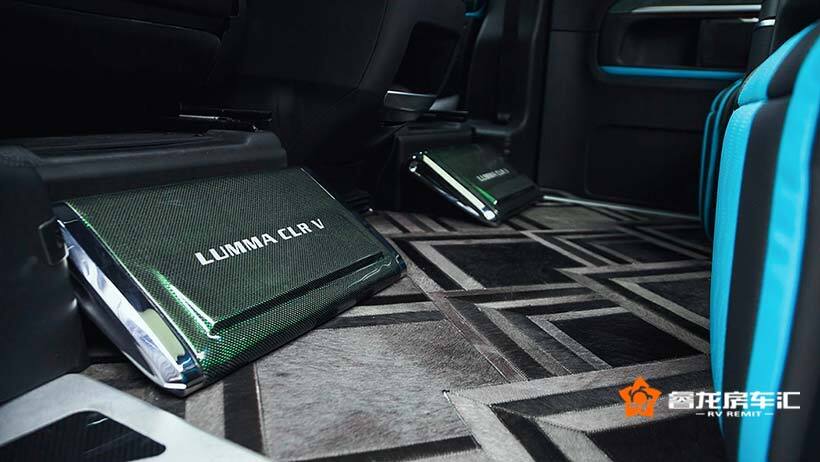 LUMMA CLR V后舱内饰装饰也是很有个性化特色的。虏曼元素的自然融入,碳纤维饰材,Alcantara皮等大部分豪华商务车都会选用饰材。星空车顶“繁星点缀”,蓝调氛围灯饰环绕,LED顶灯照明,车内氛围温馨感而舒适。独立的脚踏配置,大尺寸的液晶屏幕,隐藏梳妆镜等,日常出行生活更细节化。