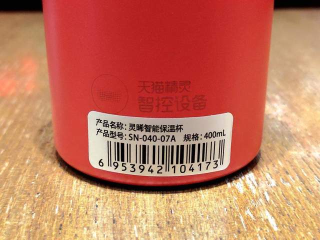 而在保温杯的底部位置,这里来带来了产品的型号、规格的条码标签贴纸外,还有“天猫精灵 智控设备”的标识。这意味着德国Simita施密特人工智能物联网保温杯的整体使用,需要配搭天猫精灵这个智能语音助手使用,才能完全发挥其智能功能,否则就是一个普通的保温杯了。