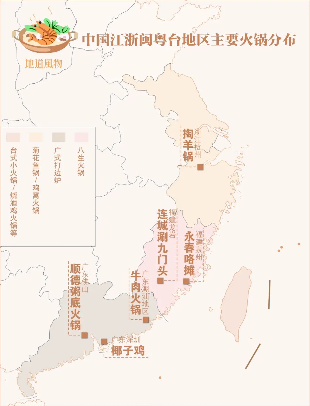 ▲ 中国江浙闽粤台地区主要火锅分布。制图 /伍攀
