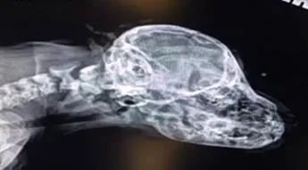 医生给小狗拍摄了X光照后发现,小它的尾巴并没有和头骨连接在一起。