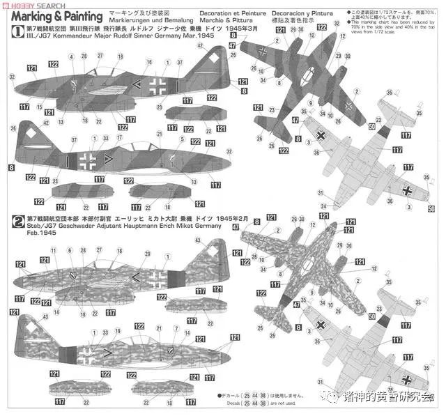 此时JG 7所属的Me 262即为后期的RLM 81/82/76涂装色系。 但紫棕色与浅绿色涂料性质并不稳定,在日晒雨淋下易褪色而形成不同色调。