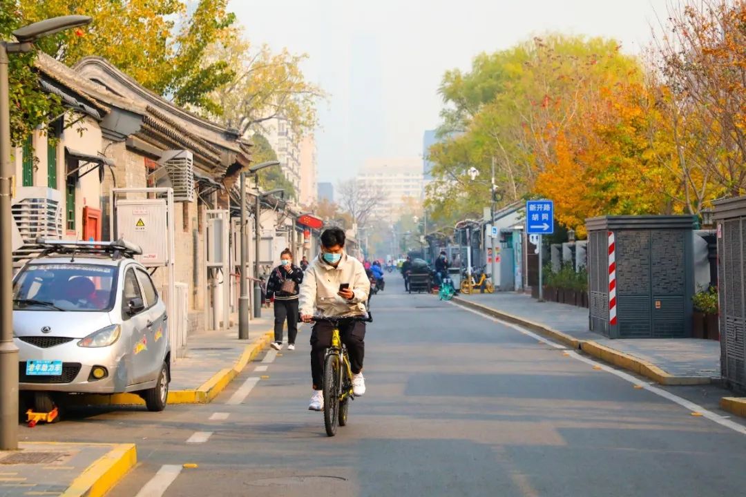 看两侧银杏冲出墙围,看平常百姓简单而平凡的日常,骑着自行车穿行其中。