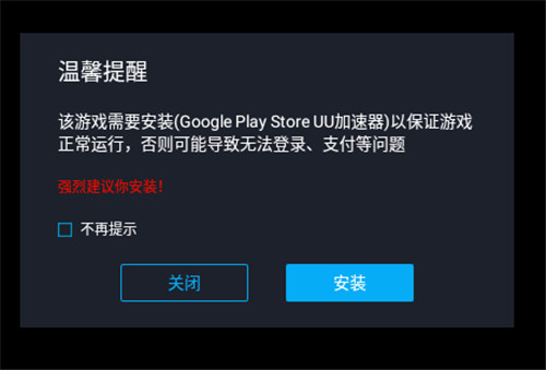 安装完成并启动游戏后,模拟器会提示下载安装游戏所需的“Google三件套”等软件, 还有“UU加速器”,我们只需要点击安装即可。