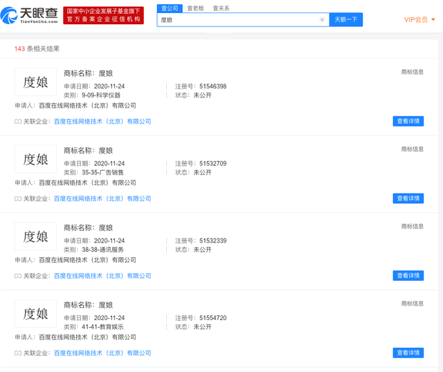近日,据企查查信息显示:百度在线网络科技(北京)有限公司注册并申请了“度娘”商标,国际分类包含-广告销售,38-通讯服务,41-教育娱乐,09-科学仪器等,目前商标状态均处于“申请中”。