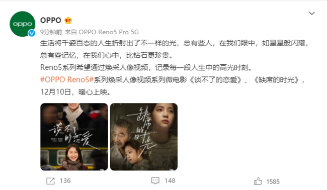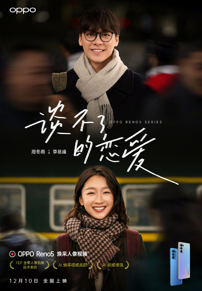 日前,OPPO官方微博上线了两张焕采人像视频系列微电影的预告海报,据了解,由李易峰、欧阳娜娜、周冬雨所参演的《谈不了的恋爱》和《缺席的时光》两部微电影,将在12月10日和Reno5系列一起亮相。