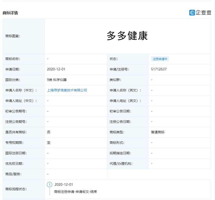 企查查APP显示,拼多多关联公司上海寻梦信息技术有限公司于12月1日申请注册“多多健康”商标,涉国际分类科学仪器、设计研究,商标状态为“注册申请中”。