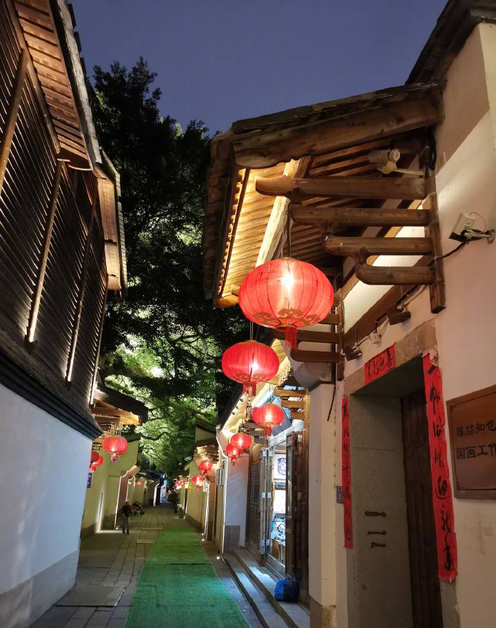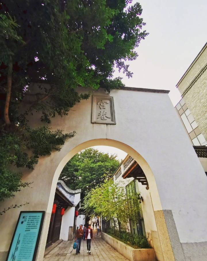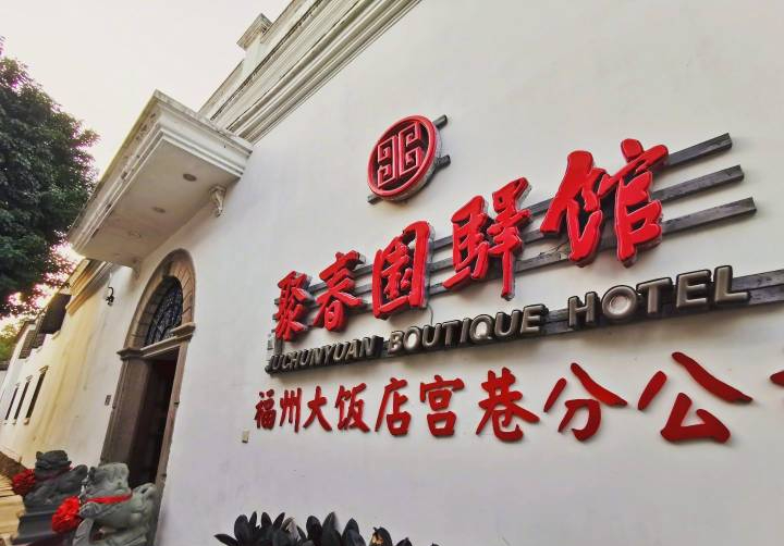 早上从广州出发,高铁到福州五个多小时,很方便。从福州南站打车直接到了三坊七巷老街,从宫巷进入百米,就到了福州百年老店聚春园驿馆。