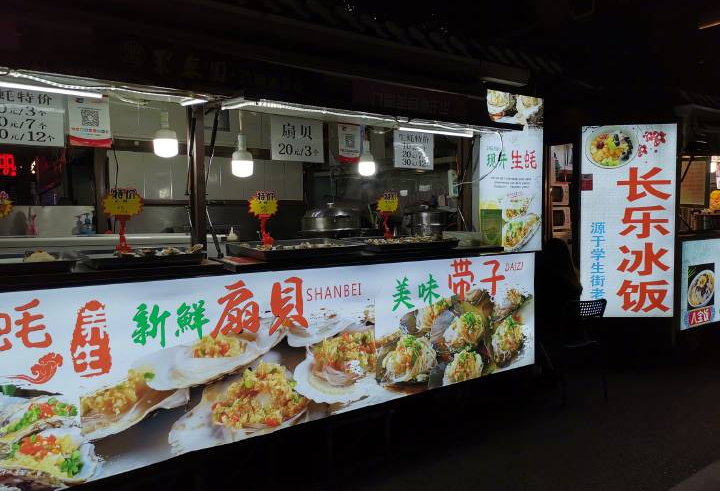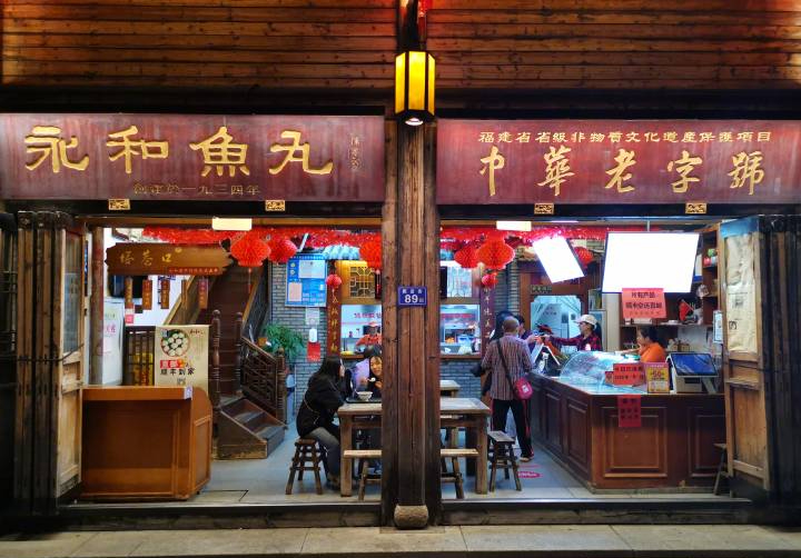 这里不仅有福州本土特色,鱼丸肉燕、达道牛肉等传统美食,还有沿街各种种类繁多的大众喜闻乐见的小吃、甜品,这生意旺得很,各种烤鱼、烤鸡、生蚝、火锅、烤串,吃啥有啥!吃完就可以走到对面的三坊七巷继续逛街,爽歪歪。。
