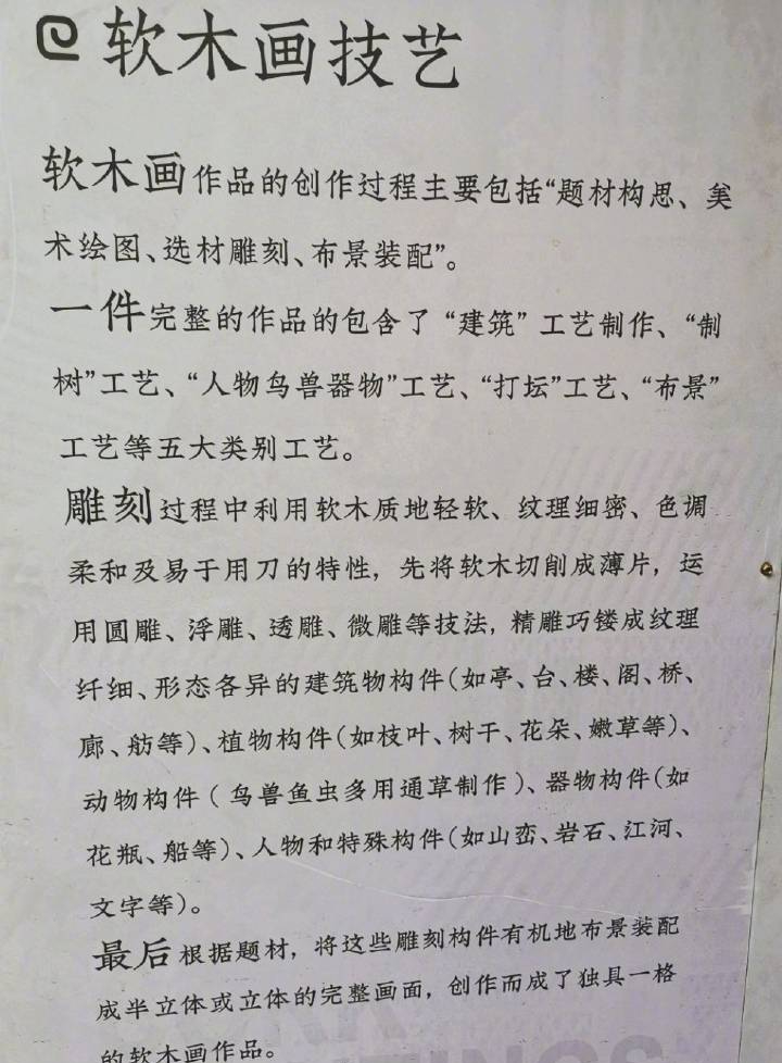 运用浮雕、圆雕、透雕等技法,精雕细镂成花草树木亭台楼阁、栈桥船舫和人物,再用通草作成白鹤、孔雀、糜鹿等鸟兽,根据画面设计,粘在衬纸上,配制成立体、半立体的木画,装在玻璃框里,就成了独具一格的艺术品。