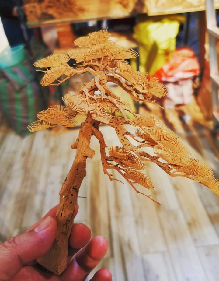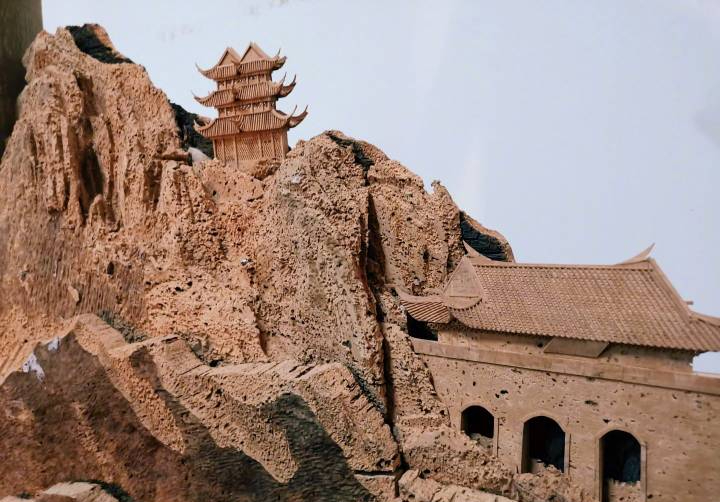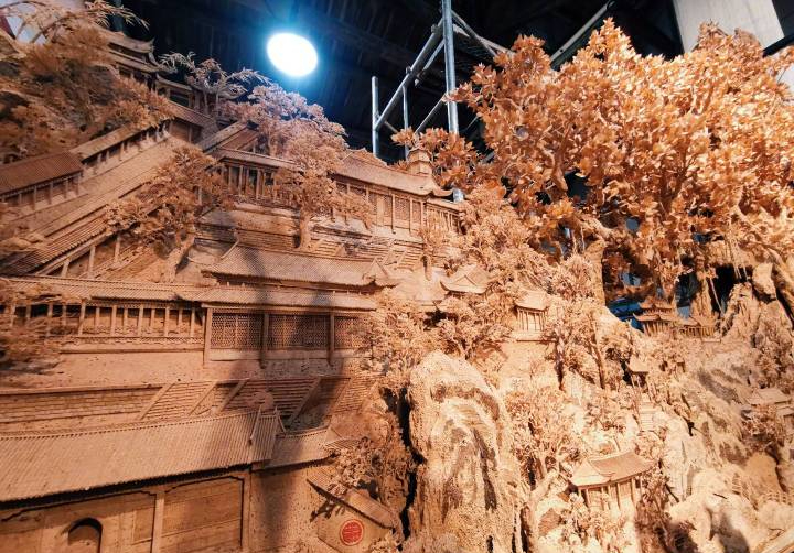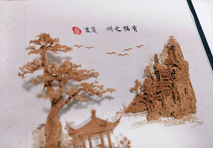 巧匠们利用软木质地轻软、纹理细密、色调柔和的特性,运用传统的民间雕刻技艺,以刀代笔,将软木精心雕镂成中国画式的亭台楼阁、花草树木等零部件,再根据创作设计,将这些零部件有机组合成一幅完整的景观。