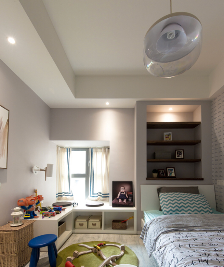 用50cm左右的搁架作为收纳,孩子可以够得到,帮助他培养自己整理东西的习惯。搁架台面可以展示模型、放装饰画,也可以加上软布垫,充当大人照看小孩时的临时座椅。