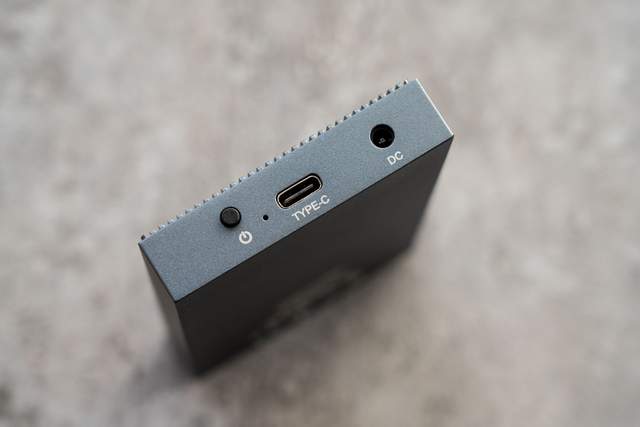 所有接口与按键都设计在硬盘盒的一侧,ORICO这款双盘位硬盘盒增加了开关,并且需要外接供电才能使用。在Type-C接口的旁边有一个LED指示灯,用来显示当前硬盘盒的工作状态。