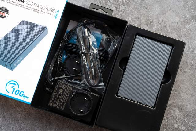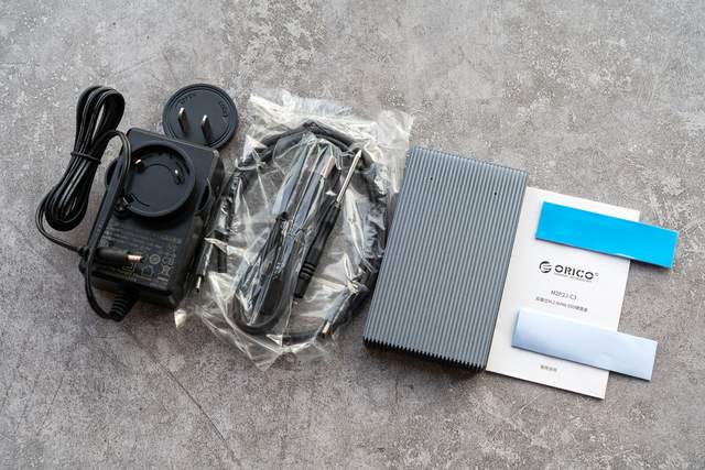 ORICO这款硬盘盒采用了合金材质打造,外观看起来非常的硬朗,金属感极强。配件可以说非常的丰富,不仅包括了C to C、C to A两根线,同时还有导热硅脂、螺丝刀以及支持更换插头类型的电源适配器。