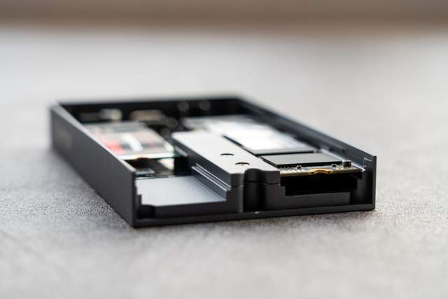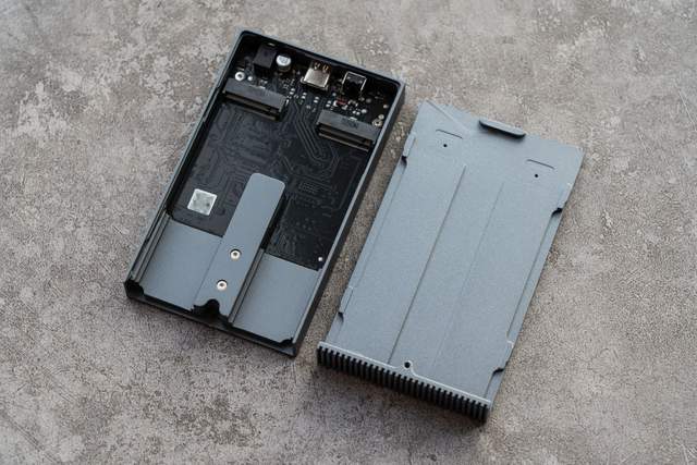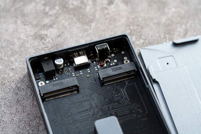 硬盘盒的内部设计很规整,左右各有一个M.2 NVMe硬盘接口,支持M Key以及B&M Key两种接口,并且支持2242、2260、2280多种尺寸。