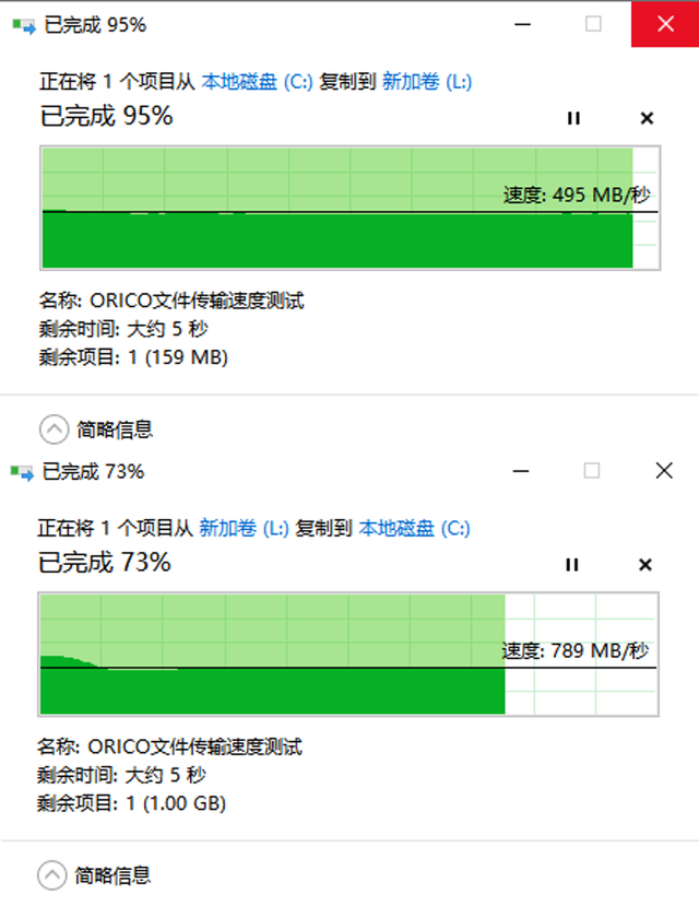 这款ORICO双盘位NVMe硬盘盒内部采用了ASM2362+ASM2806A双主控芯片设计,并且支持UASP加速协议。插上电脑后很快就顺利被识别,在文件拷贝速度测试中,从电脑上的固态硬盘复制到移动硬盘时的速度大约为500MB/秒,反向复制时速度大约为790MB/秒,这样的速度表现非常令人满意。