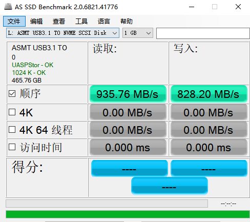 通过AS SSD Benchmark的测试,顺序读取速度约为936MB/秒,顺序写入速度约达到了828MB/秒,虽然与内置的M.2 NVMe固态硬盘本身的读写速度有一定的差距,但作为移动硬盘来看,这样的速度表现已经够用了,就算是将游戏放到里面也可以稳定流畅运行。