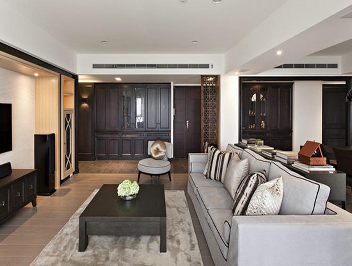 第一种是现代中式风格,这种设计就是建筑对称,也不添加太多花里胡哨的装饰雕刻,就直接使用传统类型的家具和色彩进行雕刻,形成特殊的形状。为了体现出现代感,布置一款现代气息的长沙发,再布置一些融合传统中式和现代中式的家具来进行点缀。