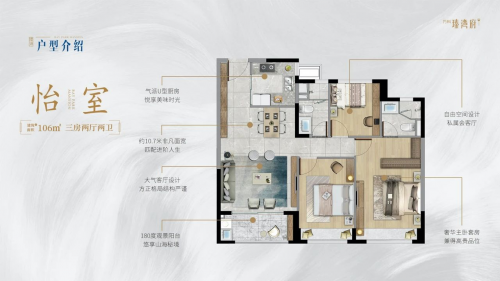 106㎡(建面约)三房,整体室内净宽4.2米竖厅设计搭配上3.8米落地阳台门,将景观引进户内面积约23㎡左右;基本上相当于是市面上140平的户型。平时邀请朋友来聚会10个人,都不会拥挤。
