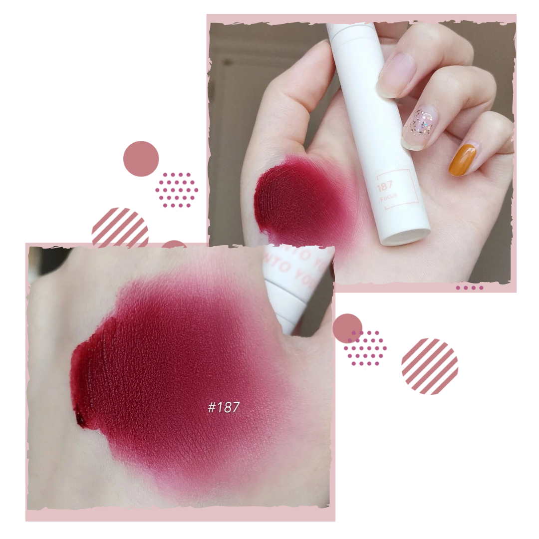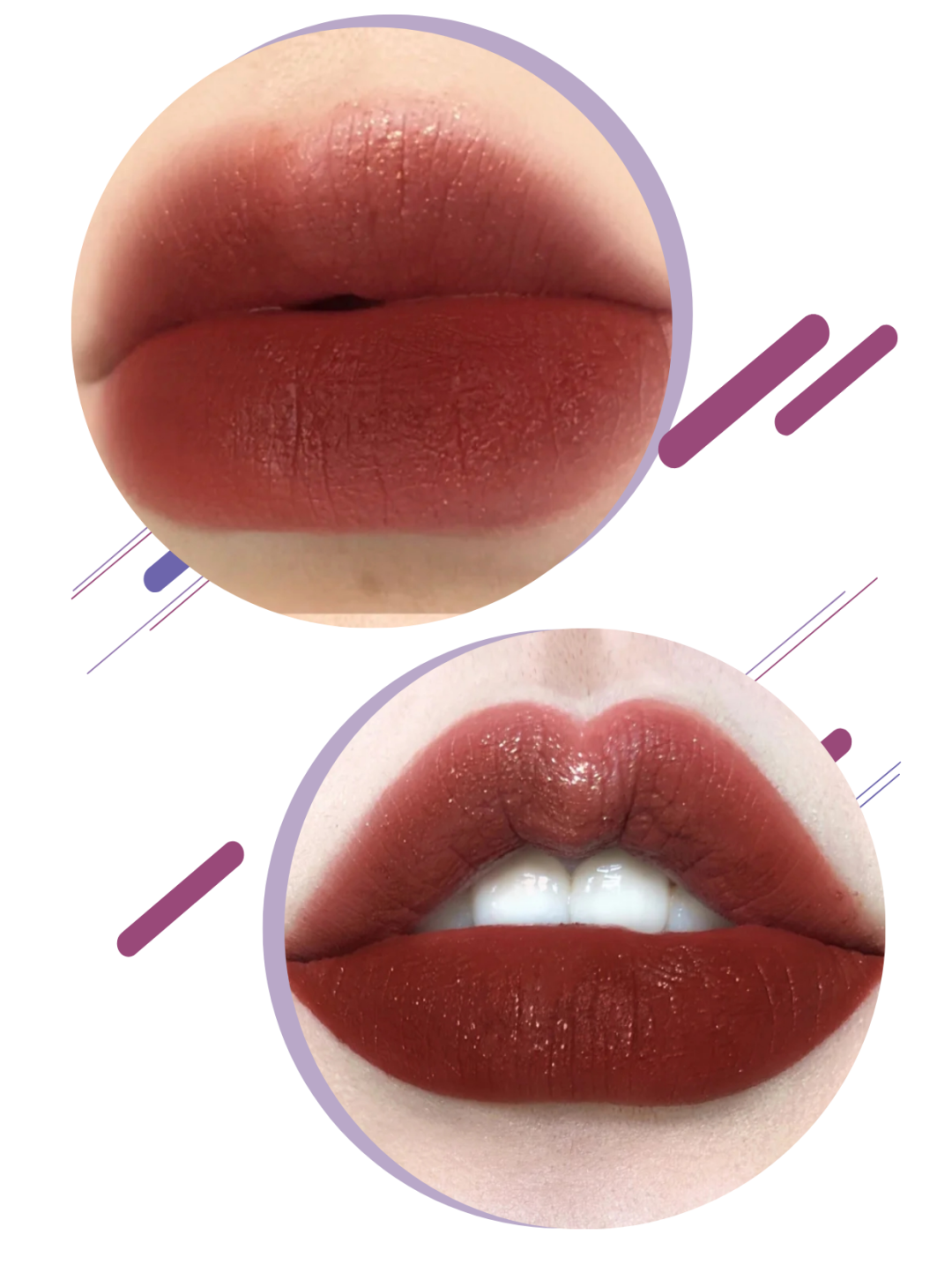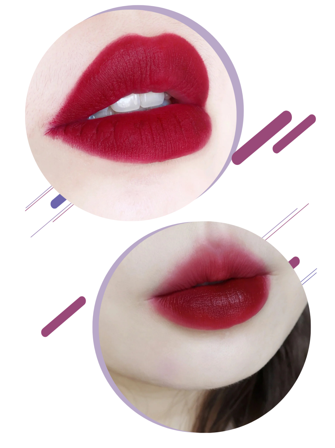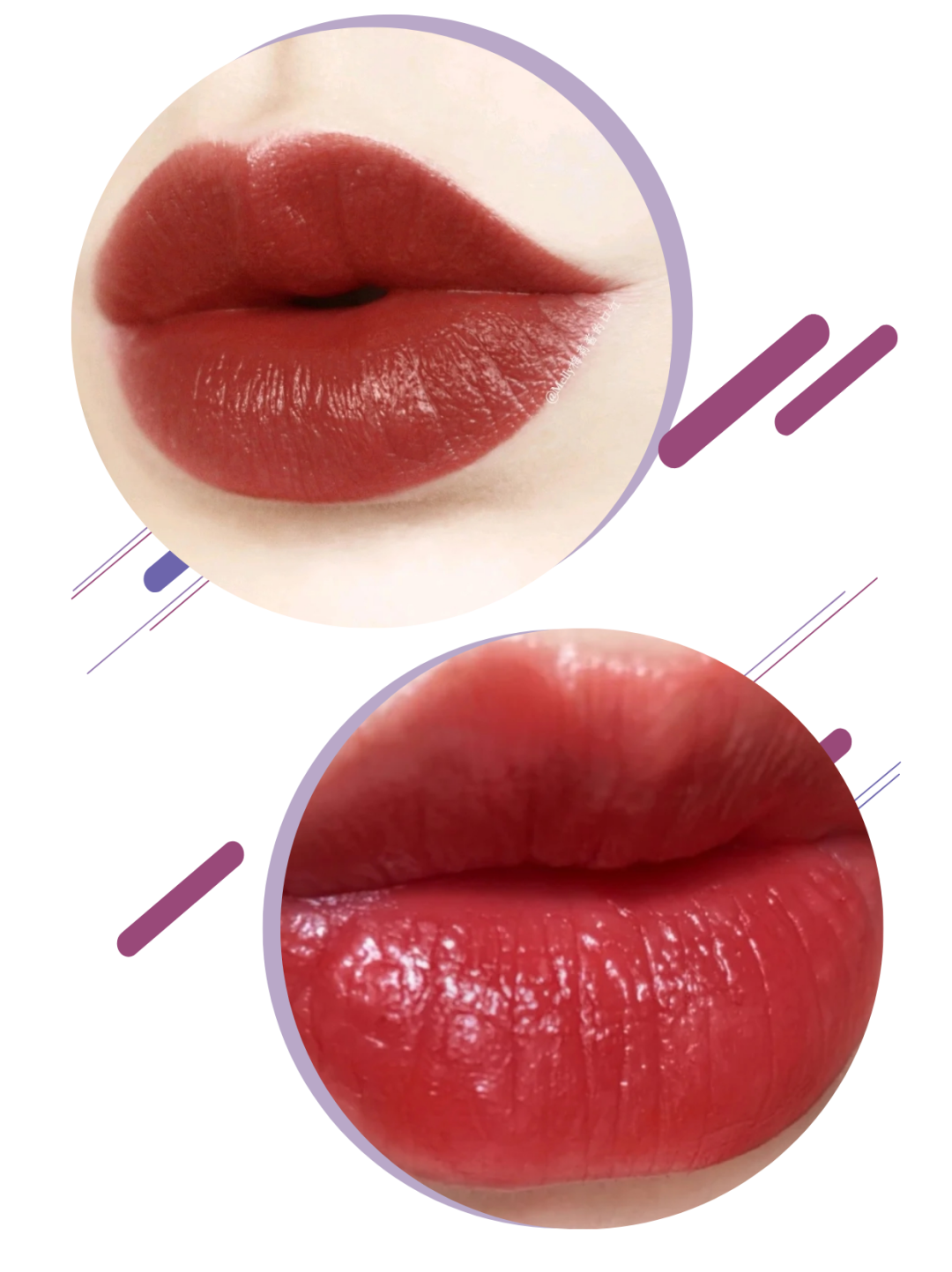 颜色是真的好好好好看啊!带一点点玫调 一点都不紫!厚涂更加温柔和显气质,带着些樱桃甜酒调的暗红,可以遮盖住原本的唇色!