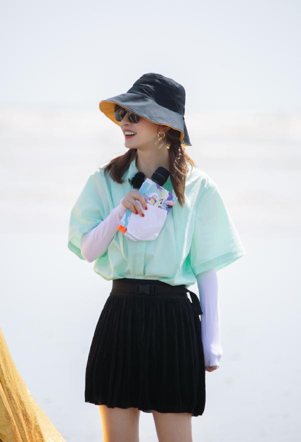 吴昕时尚感很强,私服品味也很不错,对各种穿搭look都能轻松驾驭,即便只是普通单品,经过简单搭配后,依旧能呈现出满满时尚气息,着实很有吸引力。只见她穿着一件薄荷绿短袖衬衣,版型款式比较简洁,淡绿色调清雅大方,搭配白色冰袖增添些许层次感;下面则搭配黑色短裙,裙摆加入百褶元素,腰间系着黑色腰带,将衣摆收进裙腰里更显干练,搭配黑灰拼色渔夫帽时尚感满满。