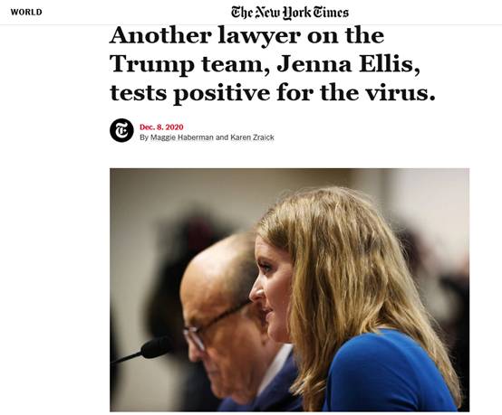 【环球网报道 见习记者 侯雅龄】据《纽约时报》8日报道,一位熟悉情况的白宫官员透露,特朗普的高级法律顾问珍娜•埃利斯(Jenna Ellis)新冠病毒检测呈阳性。该媒体称,本月2日她曾被拍到坐在特朗普私人律师朱利安尼旁边,后者于6日因新冠病毒检测呈阳性入院接受治疗。