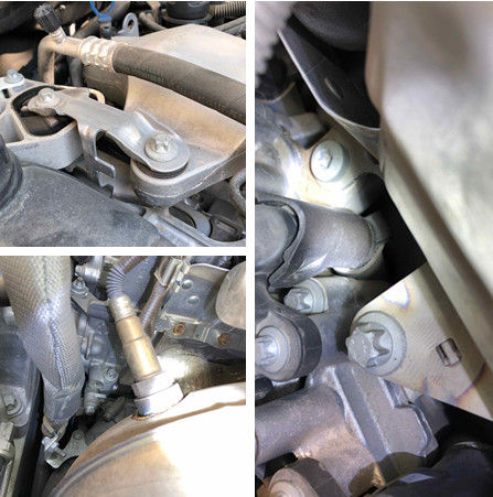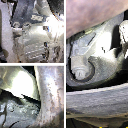 发动机元宝梁托架无拆卸痕迹,发动机和变速箱的情况良好,没有发现渗油和漏油的现象,各个部件的固定螺丝和链接螺丝均无拆卸和拧动痕迹。