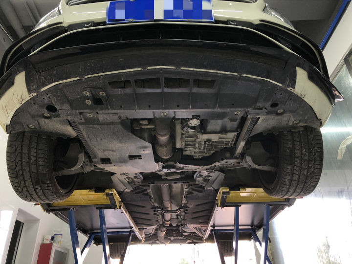 路试结束以后,来到提前约好的上架地点,将车辆举升起来,可以看到这辆车的底盘还是挺规整的,无明显的托底痕迹,甚至没有多余的灰尘泥渍。