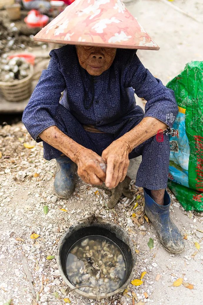 阿婆守着一只小桶,桶里都是去壳的生蚝,阿婆的脸上满是皱纹。当然,村中也有未经处理的生蚝直接可以买。