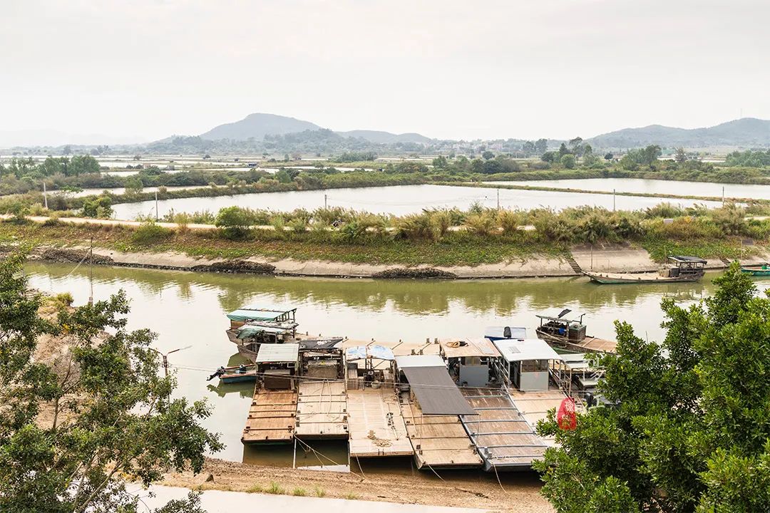 看到水面上的蚝棚了吗?一片一片,就像是棋盘格一样,蚝就是在这里长大的。