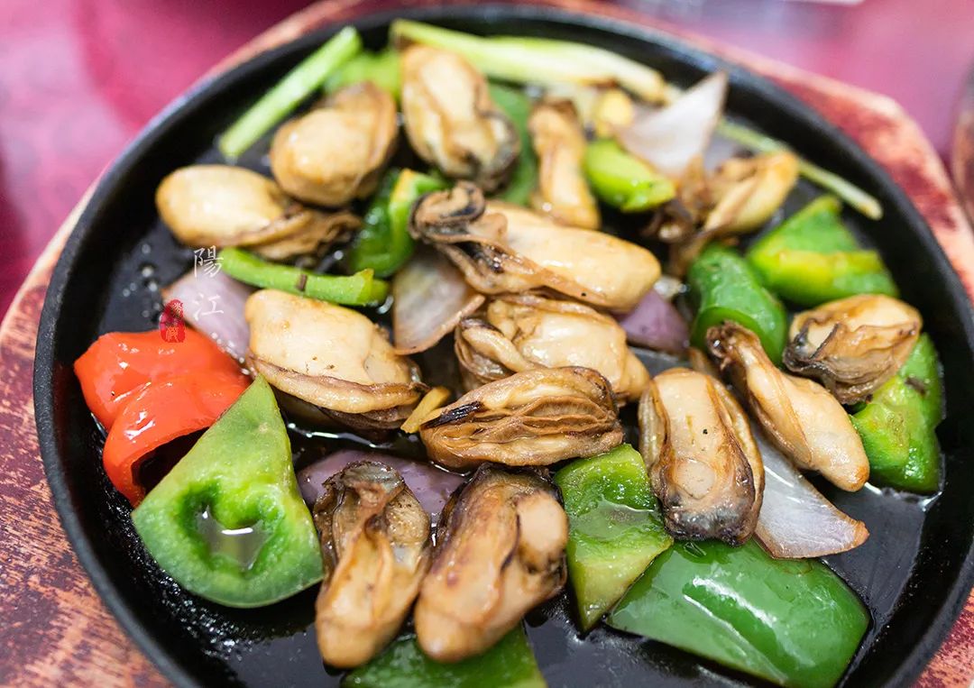 铁板生蚝,送上来的时候铁板还滋滋响着。青红椒之间的生蚝,经过铁板加热,从乳白色变成了微微的焦黄色,看上去更有食欲了。