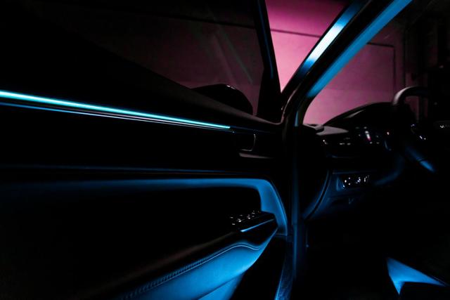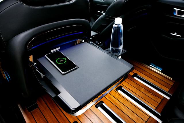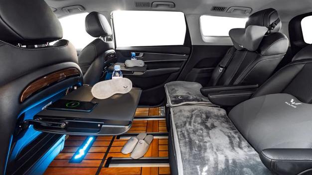 从图中可以看到,"升舱"后的车内空间肉眼可见的更豪华了:进口柚木铺就的游艇木地板,跟飞机上一样的折叠式小桌板,还能提供手机无线充电功能,车内安装了氛围灯,乘坐的愉悦感和舒适度提升,甚至还有炫酷的迎宾灯,开门即亮,夜晚上下车更有面子……