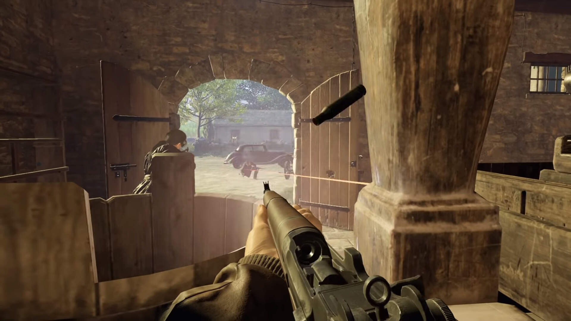 开发团队深度挖掘了 VR 带来的可能性,从已经公布的试玩片段中我们可以看到,游戏应该采用了相对传统的摇杆移动方式,虽然画面水准难与《爱莉克斯》媲美,但物理表现相当逼真,允许玩家与环境深度互动,可以使用火车车厢里的打字机(还可以从打字机上抽出打好字的纸页),也可以一手攀住山体、转过身子用另一只手开枪,预告片里甚至出现了手接柄式手榴弹后立马扔出的桥段,让人对实机体验浮想联翩。
