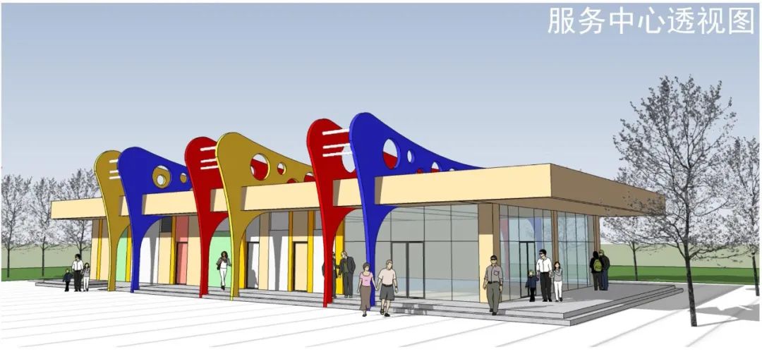 此外,建筑物还包括1个 300㎡的服务中心 和1个96㎡的公厕,设置地面 停车位49个 ,摩托车位25个。