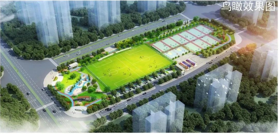 其中,体育运动区设有9个标准篮球场、1个11人足球场(可划分为2个七人场)、2个儿童篮球练习场、1个综合健身区。