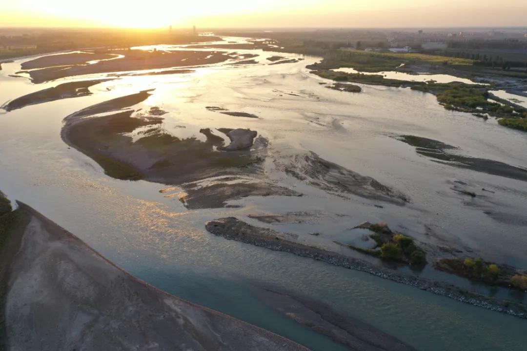 九月,秋来了。一转眼秋来了大地都变成了黄色,伊犁河的两边那绿油油的树也变成了黄色像蝴蝶般的往下飞落。夕阳打在伊犁河上,伊犁河瞬间变成了一条黄金路,微风吹过泛起鱼鳞似波浪,在阳光的照耀下闪闪发光那就更像黄金铺在河上。那弯弯曲曲的河道直到和太阳相接才停息。伊犁河弥漫着瓜果成熟的香气。