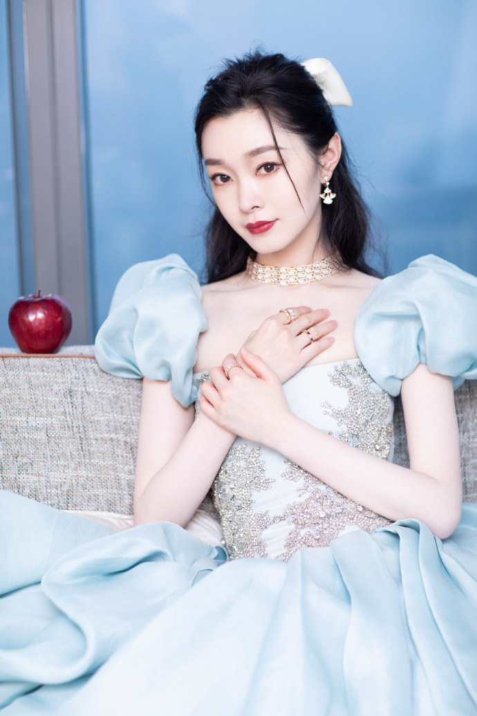 宋轶身着浅蓝色泡泡袖公主裙,金色圆形项圈点缀精致的肩颈锁骨线条,她手上拿着红苹果,仿佛像童话里出逃公主一般,优雅甜美。