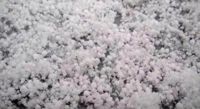 霰又称雪丸或软雹,是白色不透明的圆锥形或球形的颗粒状固态降水。直径约2~5毫米,下降时常呈阵性,触及硬地时常反跳。它是由各自冻结的小云滴组合在一起而成的,密度小而松脆易碎。
