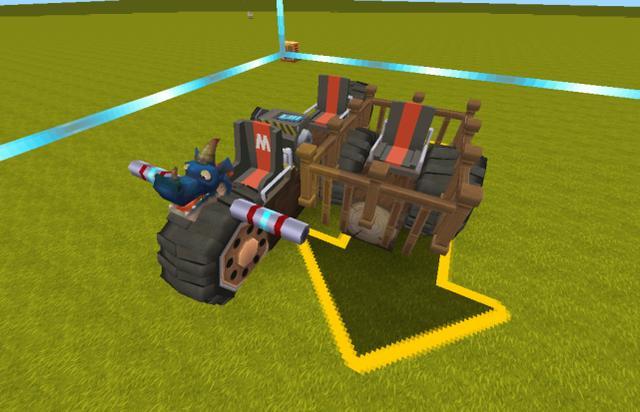 步骤五:最后一步在侧面两个车轮的中间使用方块连接在一起,然后拿出木围栏道具将四周包围起来,里面放上一个乘客座椅就可以了,车头处安放上黑龙雕像,两边安装电阻道具当做摩托车把手。