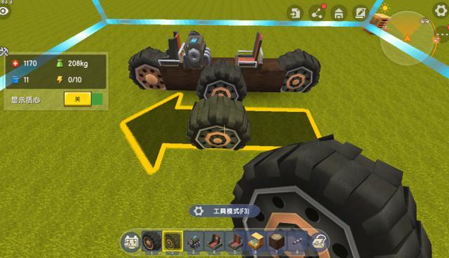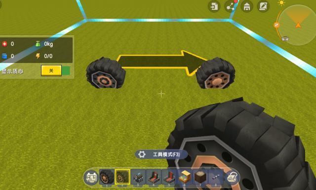 步骤二:建造三轮摩托车首先需要拿出车轮道具,在箭头指示的前面安装一个转向车轮,后面安放一个动力车轮,之间相距4个方块左右就可以了。