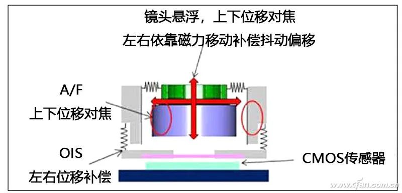 OIS光学防抖功能属于EIS的升级版,智能手机常用的OIS都是依靠磁力包裹悬浮镜头(准确来说是镜头内的镜片),镜头内的陀螺仪侦测到微小的移动,并且会将信号传至ISP即时计算需要补偿的位移量,然后通过电磁力驱动悬浮的镜头朝相反方向位移,从而使光路保持稳定,有效克服因手机的振动产生的影像模糊问题。
