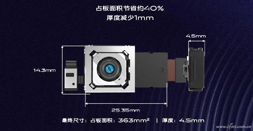 为了解决这个问题,vivo采用异形结构磁动框架堆叠方式,最终实现了微云台镜头的小型化:363平方毫米的占板面积,(模块)厚度仅有4.5mm,而且它采用双S型FPC排线,经过上百次制具调整,(排线)厚度仅有0.07mm。