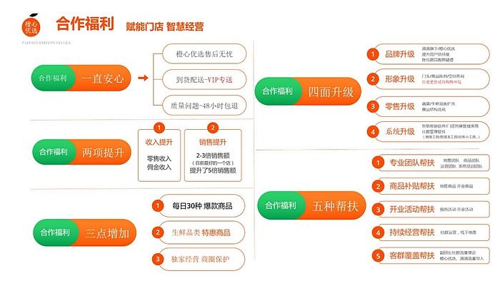 5种帮扶:橙心优选为合作团长提供地推团队、商品团队、运营团队、系统培训团队等专业团队帮扶;地推、商品、开业商品等商品补贴帮扶;预热活动、开业活动等开业帮扶;社区运营、线下推广等持续经营帮扶;客群覆盖帮扶等。