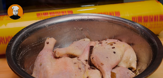 5、然后把冷却后的花椒盐擦在鸭腿上,里外都要擦到,再包上保鲜膜,腌制48小时,其中过八个小时翻一面,摆在常温下腌制就可以了