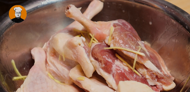 4、鸭腿放入盆中,再放入2两高度白酒,放入生姜丝,搅拌均匀腌制2个小时。准备点香叶、桂皮、八角、花椒,锅中放入300克食盐,放入准备好的香料,开中小火炒香,再放入盘中晾凉备用
