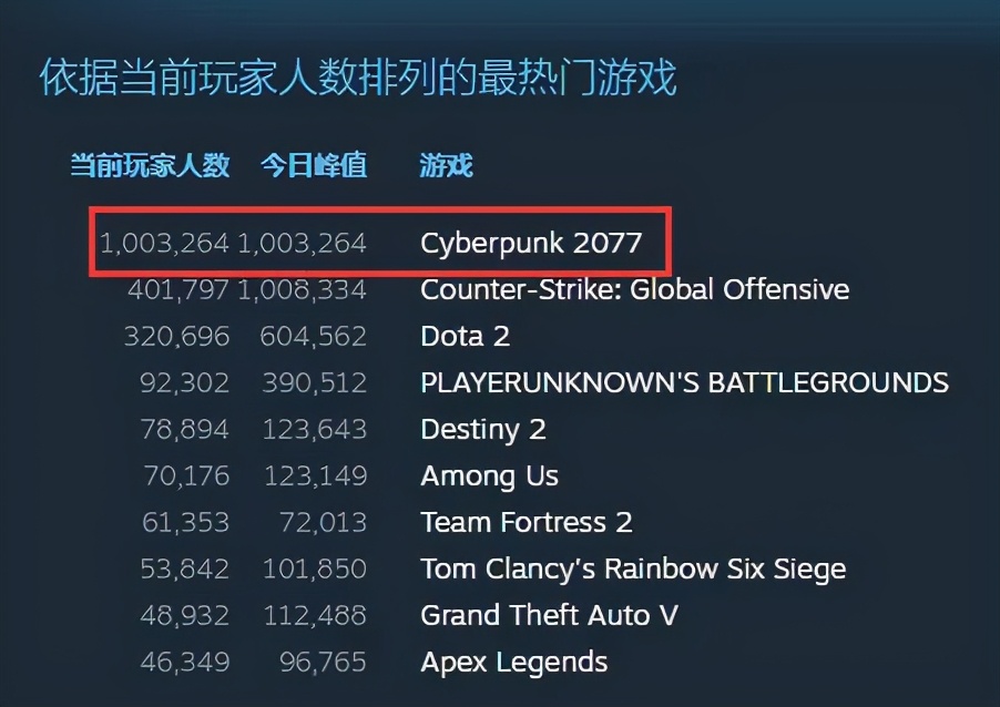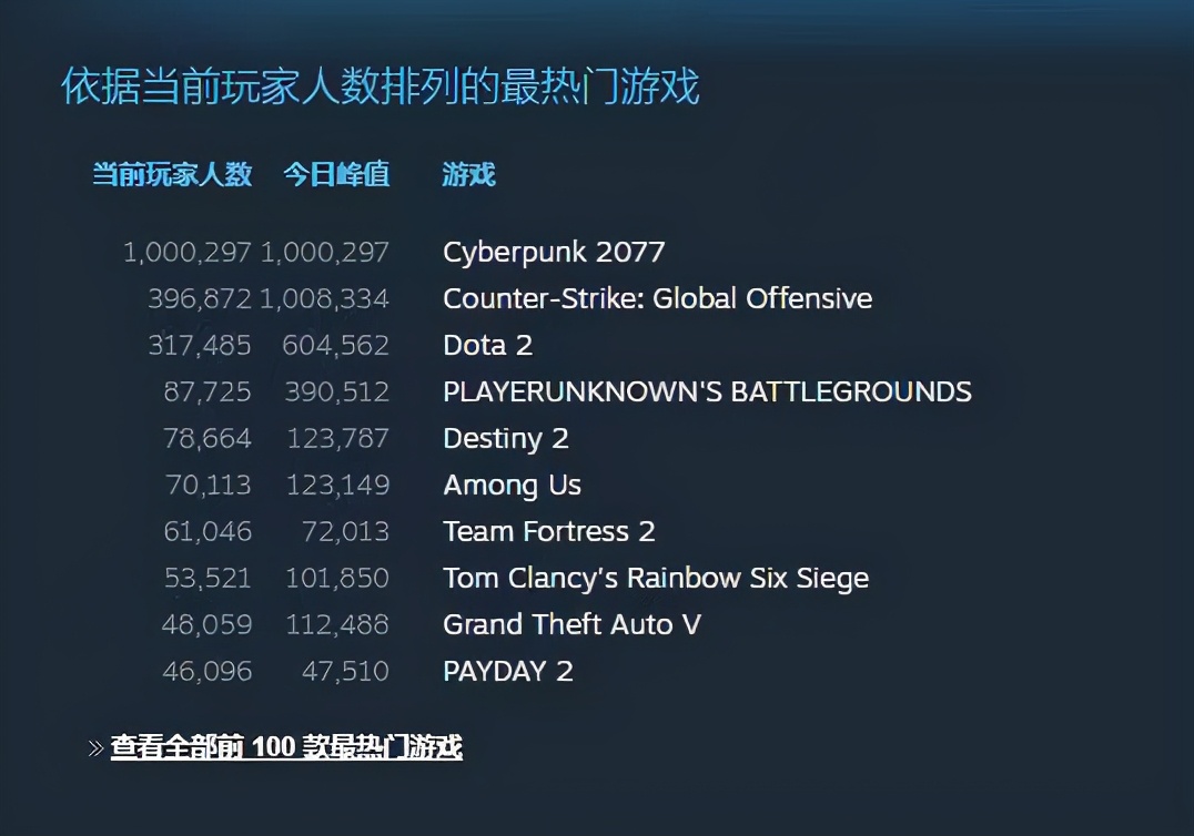 Steam中的《赛博朋克2077》解锁不到3个小时,同时在线人数就突破了100万,打了破Steam单人游戏的最高在线峰值记录,当前游玩人数更是比第二名多出了60多万人。